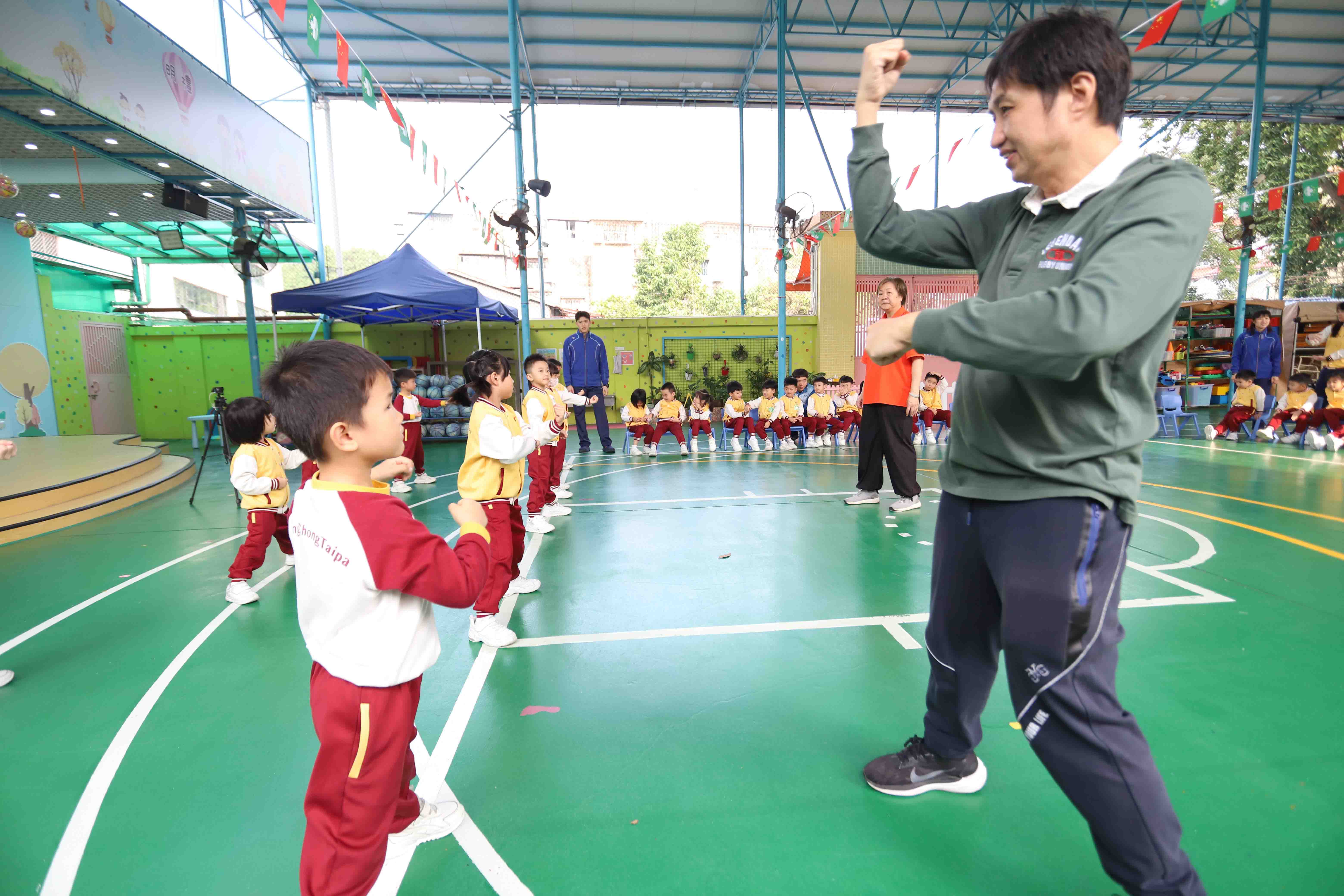 此外,學校亦邀請了澳門南派佛家拳術理事長到校,為幼兒講述南派佛家拳術的故事,李健如會長向幼兒示範了南派佛家拳中的招式「小連環」,這套招式是南派佛家拳的基礎招式,動作簡單易學。幼兒輪流學習,最後全體一起「打功夫」,場面熱鬧又可愛。